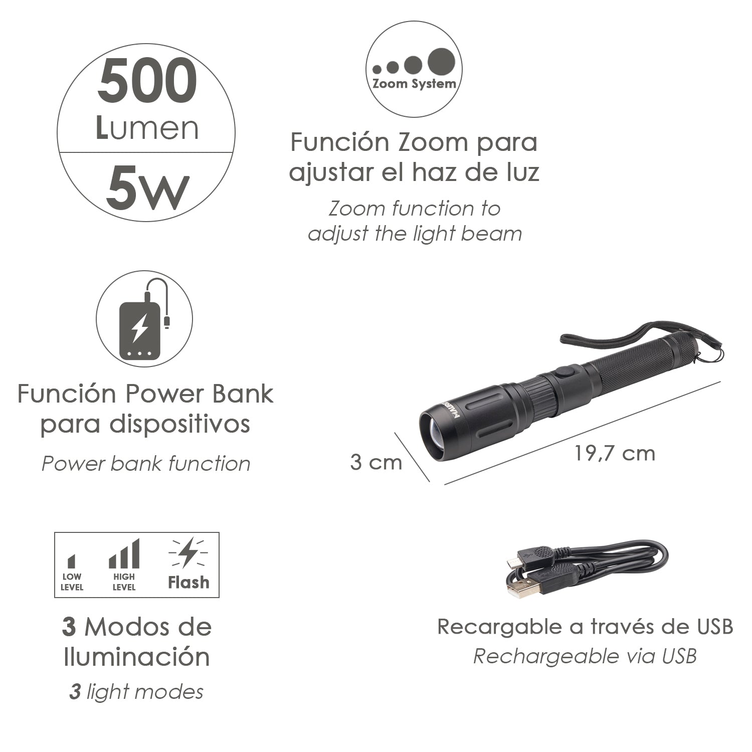 Lanterna LED portátil com bateria recarregável e função Powerbank (2.000 mAh) 500 lúmens (5 Watts) com função de zoom
