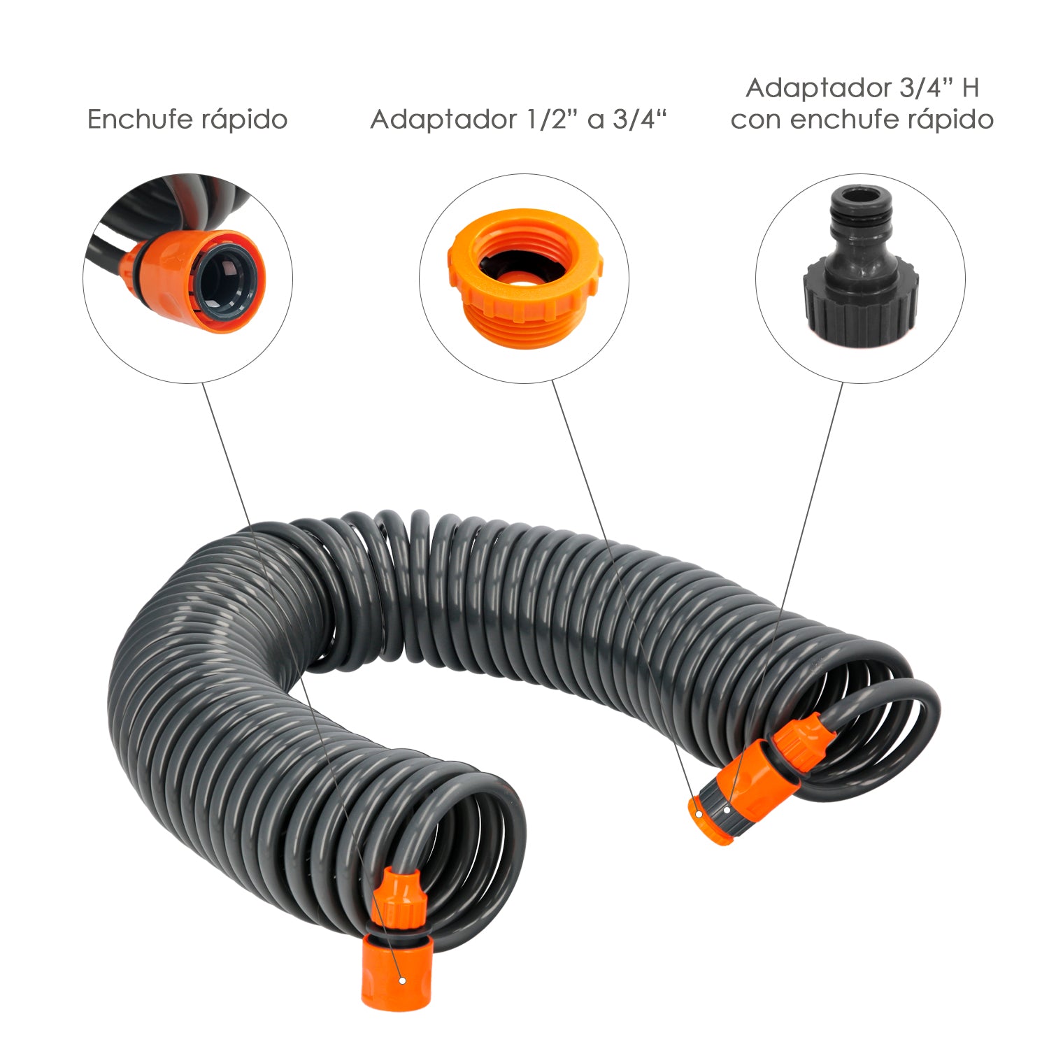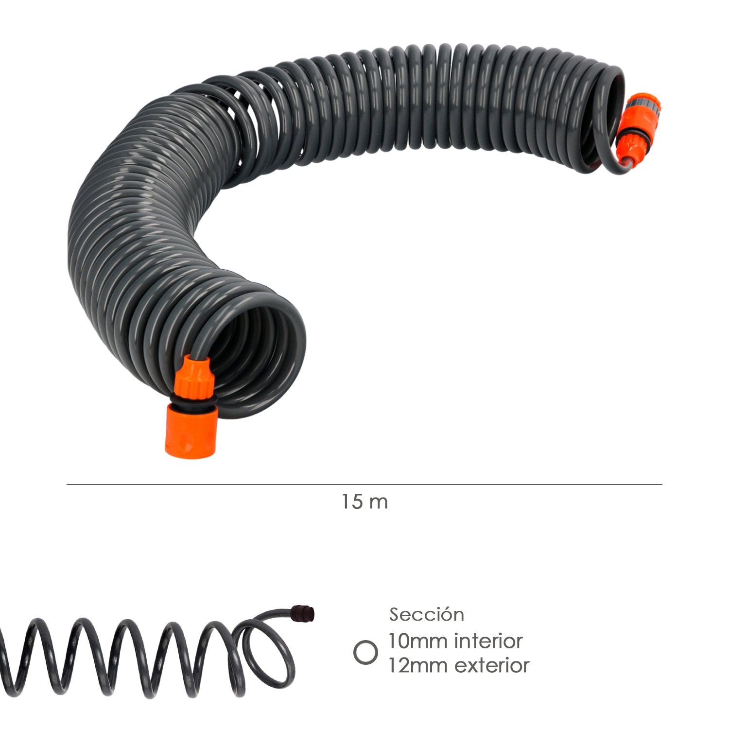Mangueira expansível espiral autoenrolável para irrigação de jardim com conectores, 15 metros